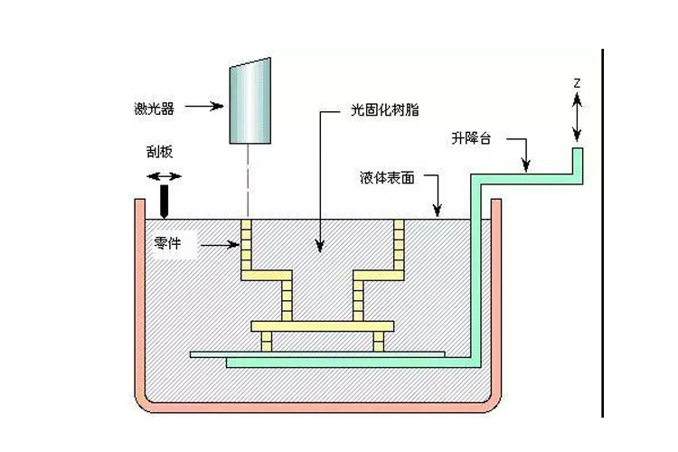 打印之前在樹脂槽中盛滿液態(tài)光敏樹脂,可升降工作臺處于液面下一個(gè)截面層厚的高度,聚焦后的激光束在計(jì)算機(jī)控制下沿液面進(jìn)行掃描,被掃描的區(qū)域樹脂固化,從而得到該截面的一層樹脂薄片;升降工作臺下降一個(gè)層厚距離,液體樹脂再次暴露在光線下,再次掃描固化,如此重復(fù),直到整個(gè)產(chǎn)品成型;升降臺升出液體樹脂表面,取出工件,進(jìn)行相關(guān)后處理,通過強(qiáng)光、電鍍、噴漆或著色等處理得到需要的最終產(chǎn)品。